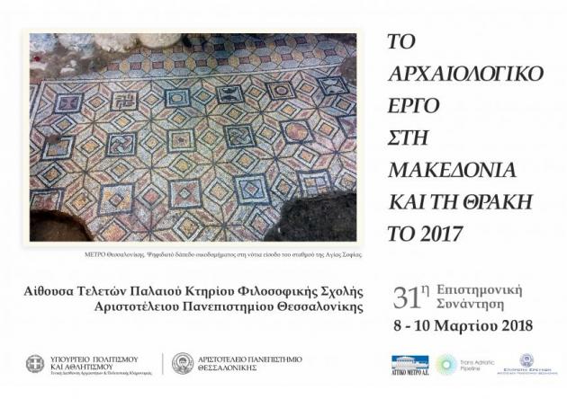 Mε 64 ανακοινώσεις και 156 συνέδρους θα πραγματοποιηθεί από 8 έως 10 Μαρτίου 2018 στην Αίθουσα Τελετών του παλαιού κτηρίου της Φιλοσοφικής Σχολής του Αριστοτελείου Πανεπιστημίου Θεσσαλονίκης η τριακοστή πρώτη ετήσια συνάντηση για τις αρχαιολογικές εργασίες στη Mακεδονία και τη Θράκη το 2017, που συνδιοργανώνεται από το Τμήμα Ιστορίας και Αρχαιολογίας του Α.Π.Θ. και το Υπουργείο Πολιτισμού.