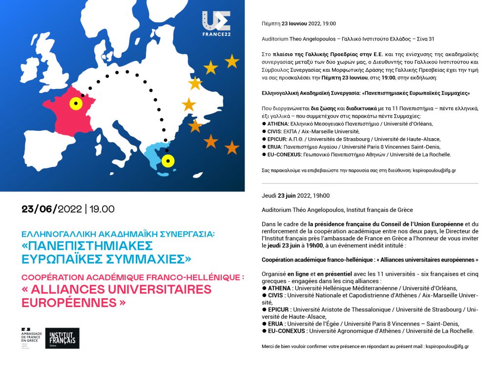 Στο πλαίσιο της ενίσχυσης της ακαδημαϊκής συνεργασίας μεταξύ των δύο χωρών μας και με διαπιστωμένο το αυξανόμενο ενδιαφέρον των Ελλήνων φοιτητών/τριών για την Τριτοβάθμια Εκπαίδευση στη Γαλλία, το Γαλλικό Ινστιτούτο Ελλάδος διοργανώνει, σε συνεργασία με τα παραπάνω 11 πανεπιστήμια, εκδήλωση για να τιμήσει τις Ευρωπαϊκές Συμμαχίες και να τις προβάλλει στο ευρύ κοινό. Η εκδήλωση θα επιτρέψει στους επικεφαλής των συγκεκριμένων πανεπιστημίων να παρουσιάσουν τη Συμμαχία τους, να αναλύσουν τη συμβολή της στην ενίσχυση της συνεργασίας και να αναδείξουν τις ευκαιρίες και τις προκλήσεις που προκύπτουν από την ανάπτυξη της ακαδημαϊκής κινητικότητας στην Ευρώπη.