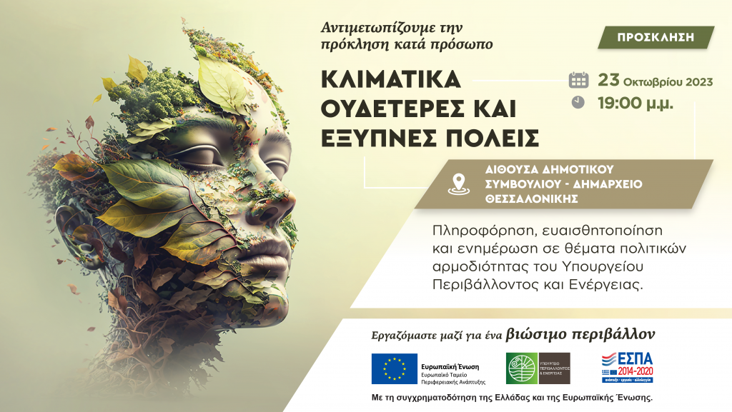 Η Γενική Γραμματεία Χωρικού Σχεδιασμού και Αστικού Περιβάλλοντος του ΥΠΕΝ σας προσκαλεί στην εκδήλωση με το επίκαιρο θέμα της Κλιματικής Ουδετερότητας που θα διεξαχθεί την Δευτέρα 23 Οκτωβρίου 2023 και ώρα 19:00, στην Αίθουσα Δημοτικού Συμβουλίου – Δημαρχείο Θεσσαλονίκης.
