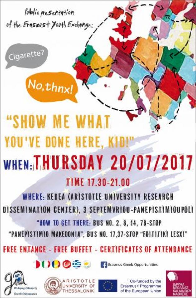 We invite you to join our Public Presentation of the results of our Youth Exchange, or watch it through the live-streaming broadcasted by AUTH, so as to approach smoking from our perspective, to try to face and eliminate it and, of course, to get to know the Opportunities provided to all young people from European Youth Exchanges.