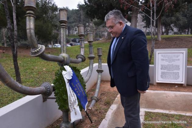 Φωτογραφία 1: Ο Πρύτανης του Αριστοτέλειου Πανεπιστημίου Θεσσαλονίκης, Καθηγητής Νικόλαος Γ. Παπαϊωάννου, καταθέτει στεφάνι στη μνήμη των θυμάτων του Ολοκαυτώματος, στο Μνημείο του Παλαιού Εβραϊκού Νεκροταφείου στο ΑΠΘ.