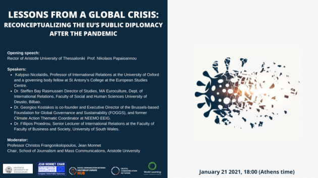 Διαδικτυακό Σεμινάριο, με τίτλο: «Διδάγματα της παγκόσμιας υγειονομικής κρίσης και η πρόκληση της ευρωπαϊκής δημόσιας διπλωματίας», θα πραγματοποιηθεί την Πέμπτη 21 Ιανουαρίου 2021 και ώρα 18:00. Η εκδήλωση διοργανώνεται από την Έδρα Jean Monnet για τη Δημόσια Διπλωματία της Ευρωπαϊκής Ένωσης του Τμήματος Δημοσιογραφίας και ΜΜΕ του ΑΠΘ, σε συνεργασία με το Εργαστήριο Ειρηνευτικής Δημοσιογραφίας και το Κέντρο Έρευνας και Καινοτομίας Νοτιοανατολικής Ευρώπης στην Ψηφιακή Επικοινωνία.