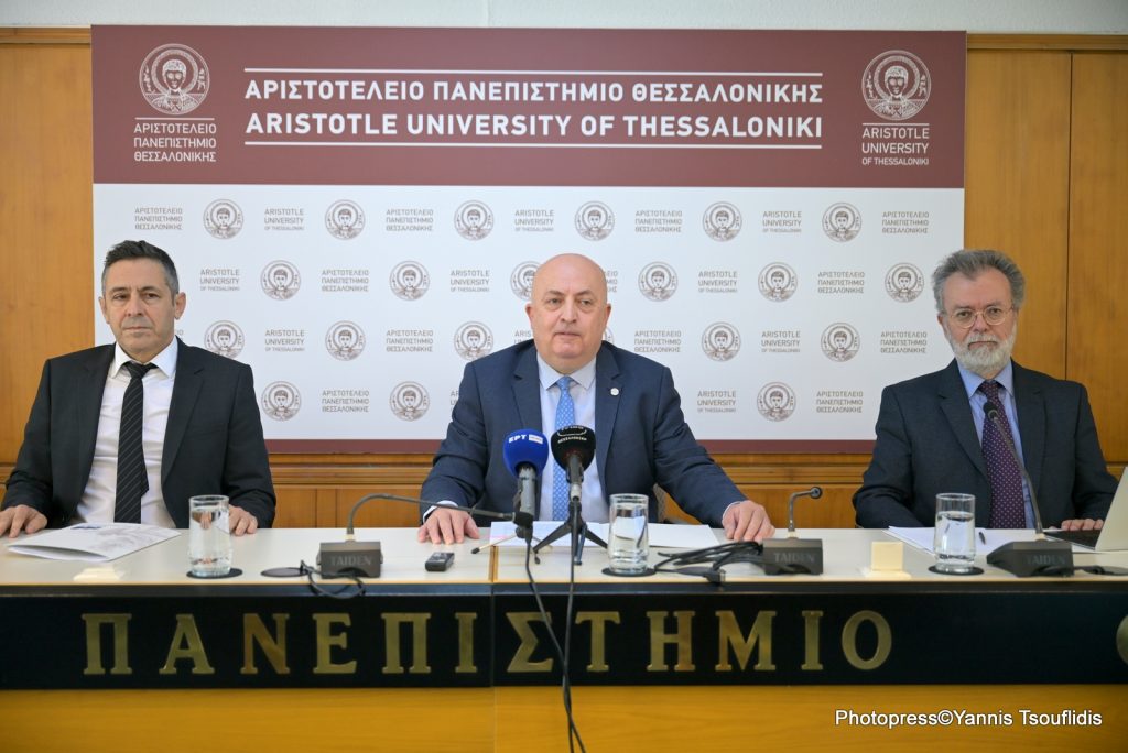 Συνέντευξη Τύπου για την παρουσίαση του προγράμματος Εορτασμού για τη συμπλήρωση 100 χρόνων από την ίδρυση του Αριστοτέλειου Πανεπιστήμιου Θεσσαλονίκης (ΦΕΚ 22/6/1925), πραγματοποιήθηκε σήμερα, Πέμπτη 10 Απριλίου 2025, στην Αίθουσα της Συγκλήτου του ΑΠΘ.