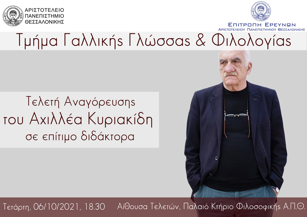 Αναγόρευση του μεταφραστή, συγγραφέα, σκηνοθέτη και θεωρητικού του κινηματογράφου Αχιλλέα Κυριακίδη σε Επίτιμο Διδάκτορα του Τμήματος Γαλλικής Γλώσσας και Φιλολογίας