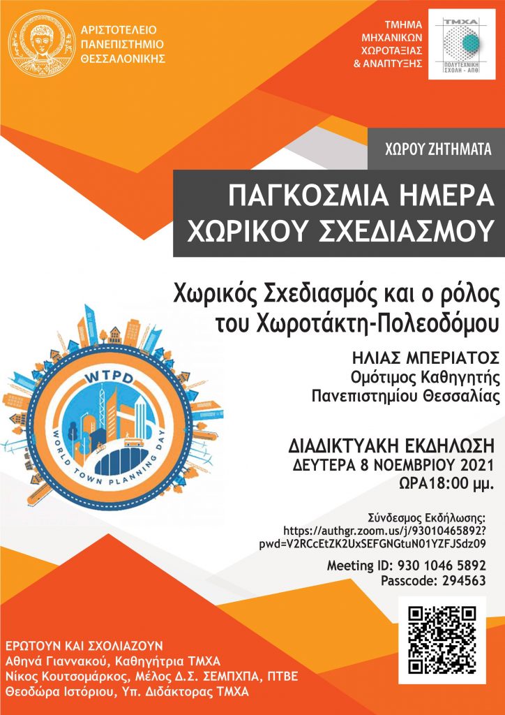 Διαδικτυακή εκδήλωση με θέμα “Χωρικός Σχεδιασμός και ο ρόλος του Χωροτάκτη-Πολεοδόμου” στο πλαίσιο των εκδηλώσεων του ΤΜΧΑ “ΧΩΡΟΥ ΖΗΤΗΜΑΤΑ” και της Παγκόσμιας Ημέρας Χωρικού Σχεδιασμού, 08 Νοεμβρίου 2021