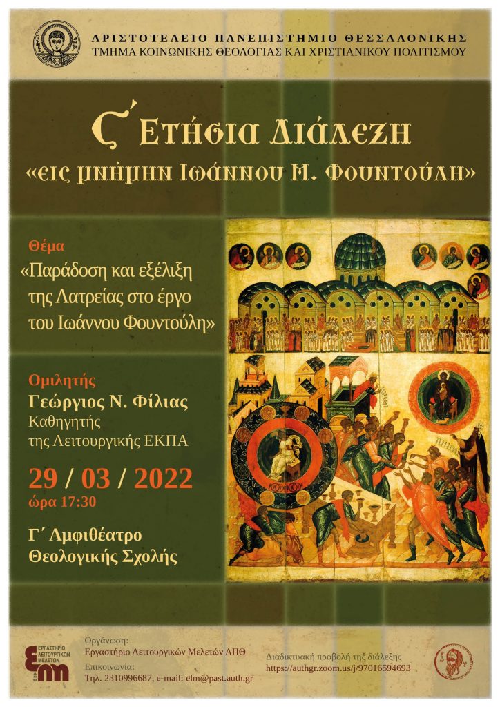 Το Τμήμα Κοινωνικής Θεολογίας και Χριστιανικού Πολιτισμού της Θεολογικής Σχολής του ΑΠΘ ανακοινώνει τη διοργάνωση της Στ ‘ Ετήσιας Διάλεξης «εις μνήμην Ιωάννου Μ. Φουντούλη». Φέτος η Διάλεξη θα πραγματοποιηθεί την Τρίτη 29 Μαρτίου 2022 και ώρα 17:30 στον Γ’ Αμφιθέατρο της Θεολογικής Σχολής. Η Διάλεξη θα προβληθεί και μέσω της εφαρμογής zoom στον εξής […]