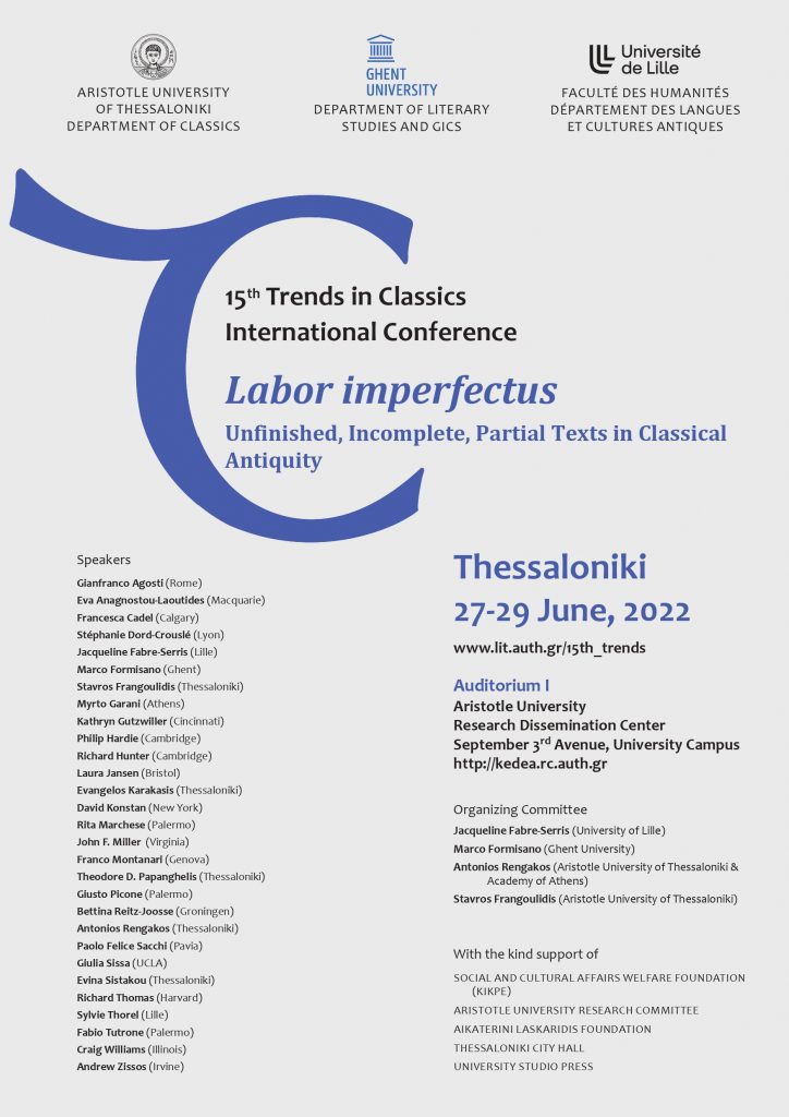 Ο Τομέας Κλασικών Σπουδών του Τμήματος Φιλολογίας του Αριστοτέλειου Πανεπιστημίου Θεσσαλονίκης σε συνεργασία με το Ghent Institute for Classical Studies (GICS), Ghent University και το Τμήμα Langues et Cultures Antiques, University of Lille διοργανώνουν το 15o Διεθνές Συνέδριο «Trends in Classics» (Σύγχρονες Τάσεις στην Κλασική Φιλολογία). Το θέμα του συνεδρίου αφορά σε κείμενα της ελληνικής […]
