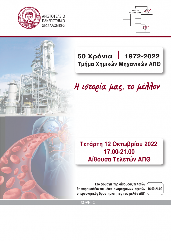 Το Τμήμα Χημικών Μηχανικών του ΑΠΘ γιορτάζει τα 50 χρόνια από την ίδρυσή του και σας προσκαλεί στην πανηγυρική του εκδήλωση τη Τετάρτη 12 Οκτωβρίου 2022, ώρα 17:00, στην Αίθουσα Τελετών ΑΠΘ