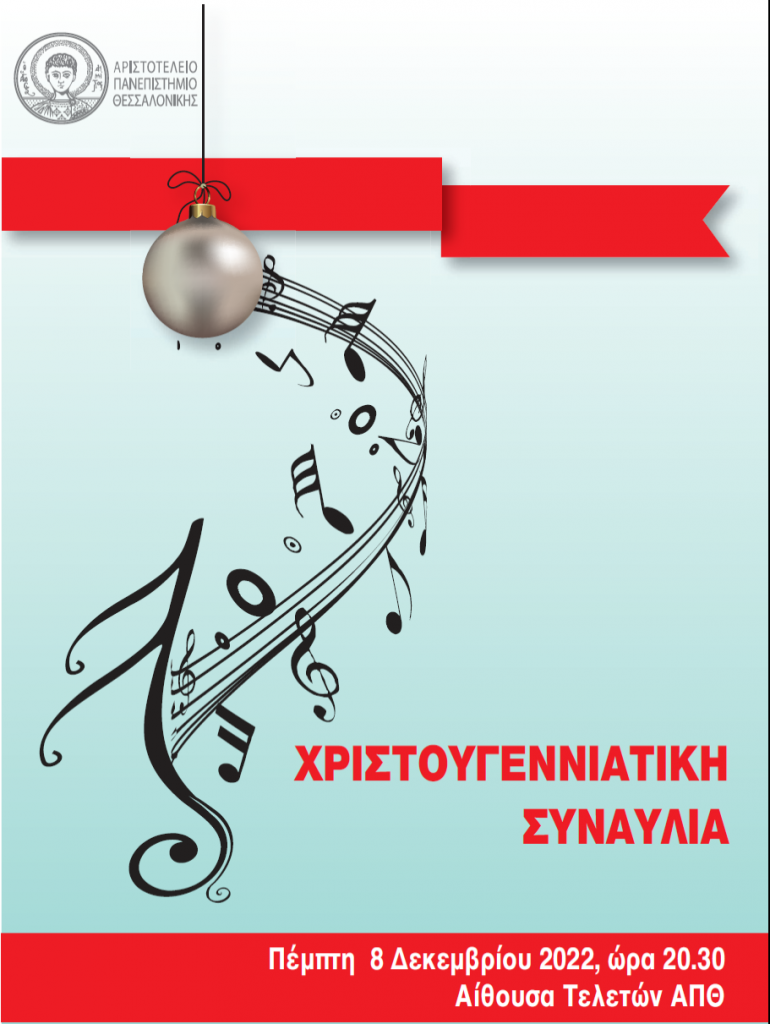 Οι Πρυτανικές Αρχέςτου Αριστοτελείου Πανεπιστημίου Θεσσαλονίκηςσας προσκαλούνστη Χριστουγεννιάτικη Συναυλίατων μουσικών συνόλων του ΑΠΘτην Πέμπτη 8 Δεκεμβρίου 2022 και ώρα 20.30, στην Αίθουσα Τελετών του ΑΠΘΤο πρόγραμμα περιλαμβάνειέργα κλασικών συνθετών, χριστουγεννιάτικες μελωδίες και κάλαντα Διευθύνουν: Βλαδίμηρος Συμεωνίδης, Εριφύλη Δαμιανού