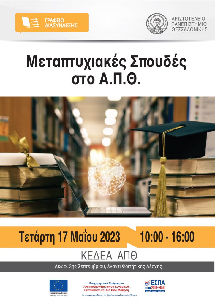 Το Γραφείο Διασύνδεσης, του Αριστοτέλειου Πανεπιστημίου Θεσσαλονίκης σας προσκαλεί στην εκδήλωση «Μεταπτυχιακές Σπουδές στο ΑΠΘ»η οποία θα πραγματοποιηθεί την Τετάρτη 17 Μαΐου 2023 στο Κέντρο Διάδοσης Ερευνητικών Αποτελεσμάτων (ΚΕ.Δ.Ε.Α.) ΑΠΘ από 10:00 πμ έως 16:00 μμ. Η εκδήλωση απευθύνεται σε φοιτήτριες/τες, απόφοιτες/ους, πανεπιστημιακούς και γενικότερα στην ευρύτερη εκπαιδευτική κοινότητα καθώς και σε φορείς της πόλης μας, με σκοπό […]