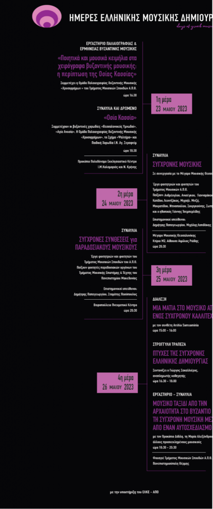 Το νεό Φεστιβάλ «Ημέρες ελληνικής μουσικής δημιουργίας» ετοιμάζει την πρώτη του έκδοση κατά τοτετραήμερο 23 με 26 Μαΐου 2023. Διοργανώνεται από το Τμήμα Μουσικών Σπουδών του ΑΠΘ, σεσυνεργασία με διάφορους φορείς της πόλης και προβάλλει την ελληνική μουσική δημιουργία, μέσα στοσταυροδρόμι εποχών και ειδών, από τα βυζαντινά χρόνια έως τη σημερινή εποχή. Περιέχει συναυλίες, εργαστήρια […]