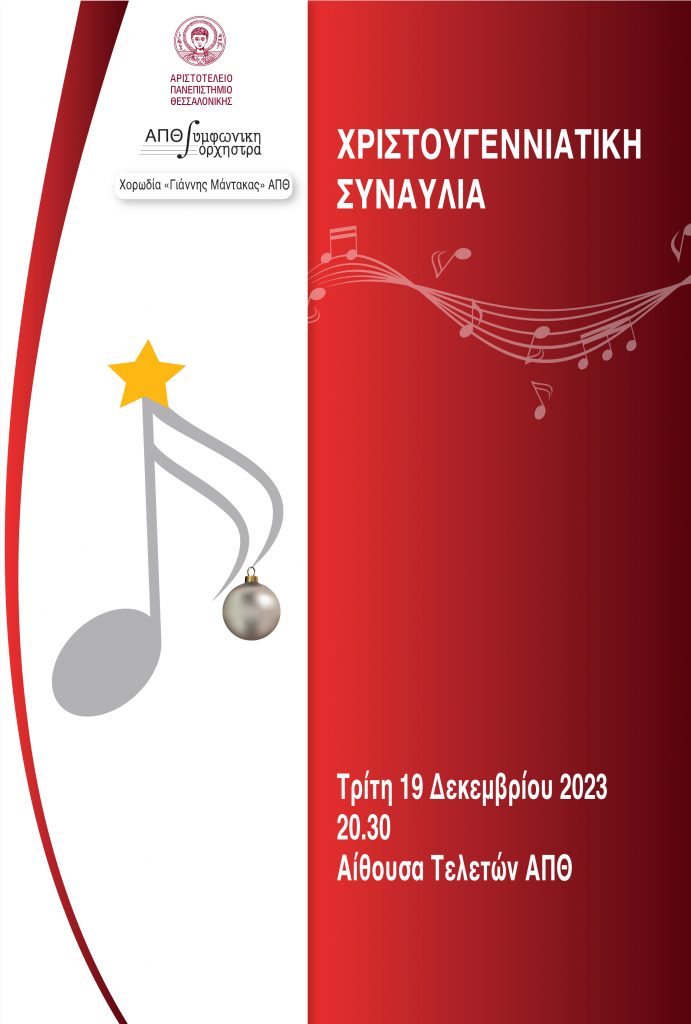 Το Αριστοτέλειο Πανεπιστήμιο Θεσσαλονίκης θα πραγματοποιήσει τη Χριστουγεννιάτικη Συναυλία του την Τρίτη 19 Δεκεμβρίου 2023 και ώρα 20:30 στην Αίθουσα Τελετών ΑΠΘ Η εκδήλωση είναι ανοιχτή για το κοινό
