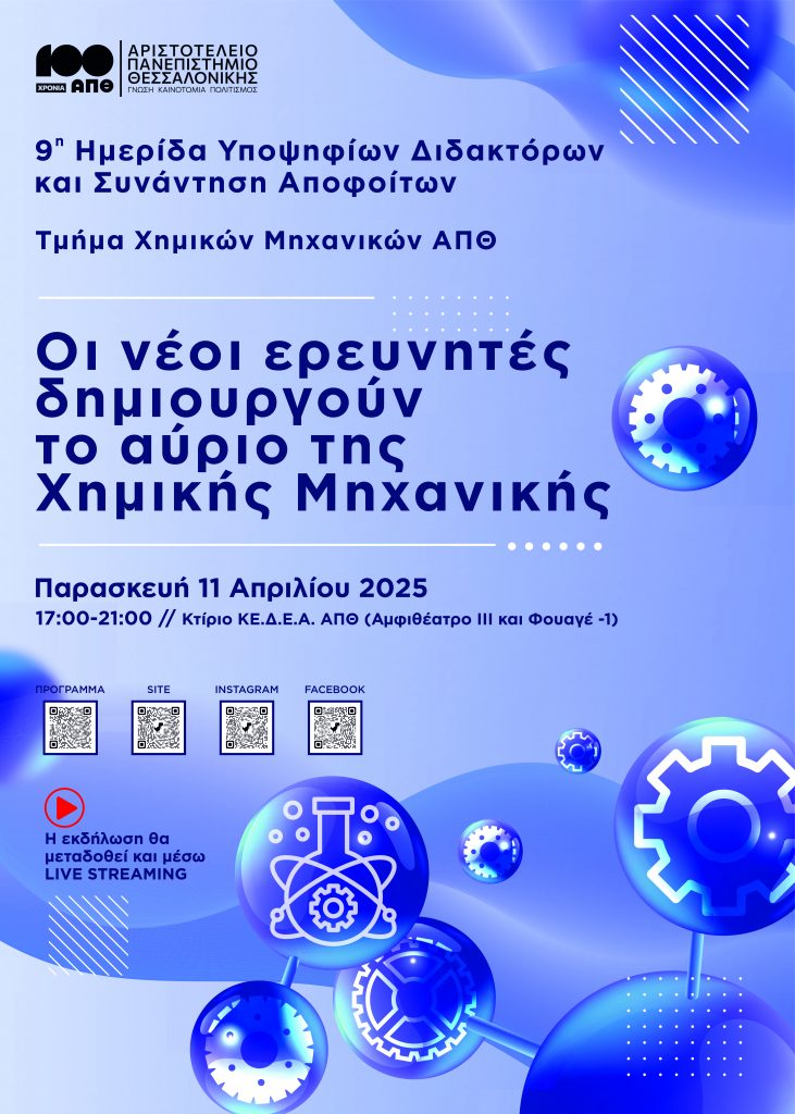 Τμήμα Χημικών Μηχανικών ΑΠΘ “Οι νέοι ερευνητές δημιουργούν το αύριο της Χημικής Μηχανικής” Παρασκευή 11 Απριλίου 2025