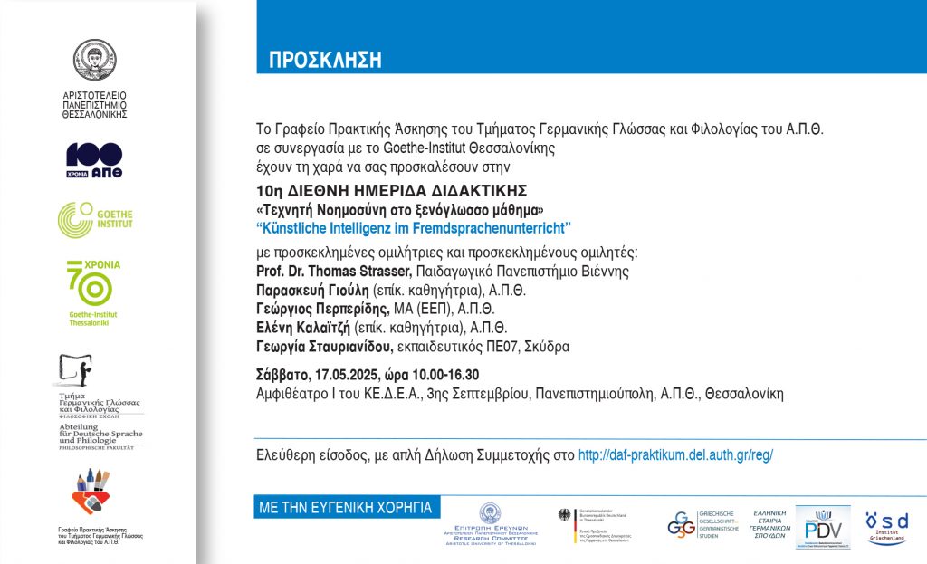 Το Γραφείο Πρακτικής Άσκησης του Τμήματος Γερμανικής Γλώσσας και Φιλολογίας του Α.Π.Θ., το οποίο συνεργάζεται με εκπαιδευτικούς ΠΕ07 και με πάρα πολλά εκπαιδευτικά ιδρύματα από το 1999, στο πλαίσιο του Προγράμματος Πρακτικής Άσκησης των φοιτητών/τριών του Τμήματος, συνεχίζει για δέκατη χρονιά τη σειρά Ημερίδων Διδακτικής. Οι ημερίδες μας έχουν συμμετοχές που αγγίζουν τους 300 εκπαιδευτικούς και επιστήμονες από την Ελλάδα και το εξωτερικό, καθώς και φοιτητές/τριες. Φέτος, για όγδοη φορά σε συνεργασία με το Goethe-Institut Θεσσαλονίκης, διοργανώνεται η 10η διεθνής Ημερίδα με θέμα:«Τεχνητή Νοημοσύνη στο ξενόγλωσσο μάθημα» / „Künstliche Intelligenz im Fremdsprachenunterricht“.