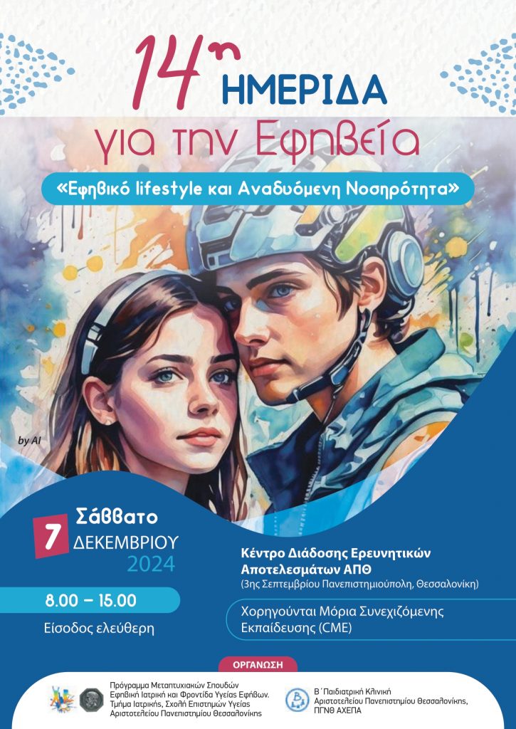 Με ιδιαίτερη χαρά σας προσκαλούμε στην 14η Ημερίδα για την Εφηβεία, η οποία θα πραγματοποιηθεί το Σάββατο 7 Δεκεμβρίου 2024 στο Κέντρο Διάδοσης Ερευνητικών Αποτελεσμάτων (ΚΕΔΕΑ) του ΑΠΘ.