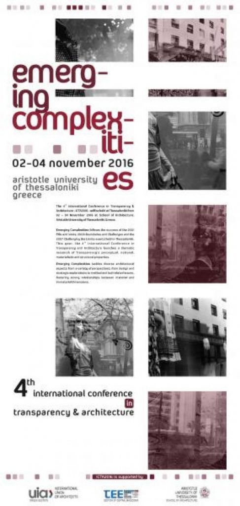 Είμαστε στην ευχάριστη θέση να σας ενημερώσουμε ότι ήδη έχουμε δεχτεί ένα σημαντικό αριθμό περιλήψεων για συμμετοχή στο 3ο διεθνές συνέδριο «Transparency and Architecture-Emerging Complexities» – που διοργανώνεται από τον Ε΄ Τομέα του Τμήματος,  και  θα διεξαχθεί στη Θεσσαλονίκη 2-4 Νοεμβρίου 2016.
