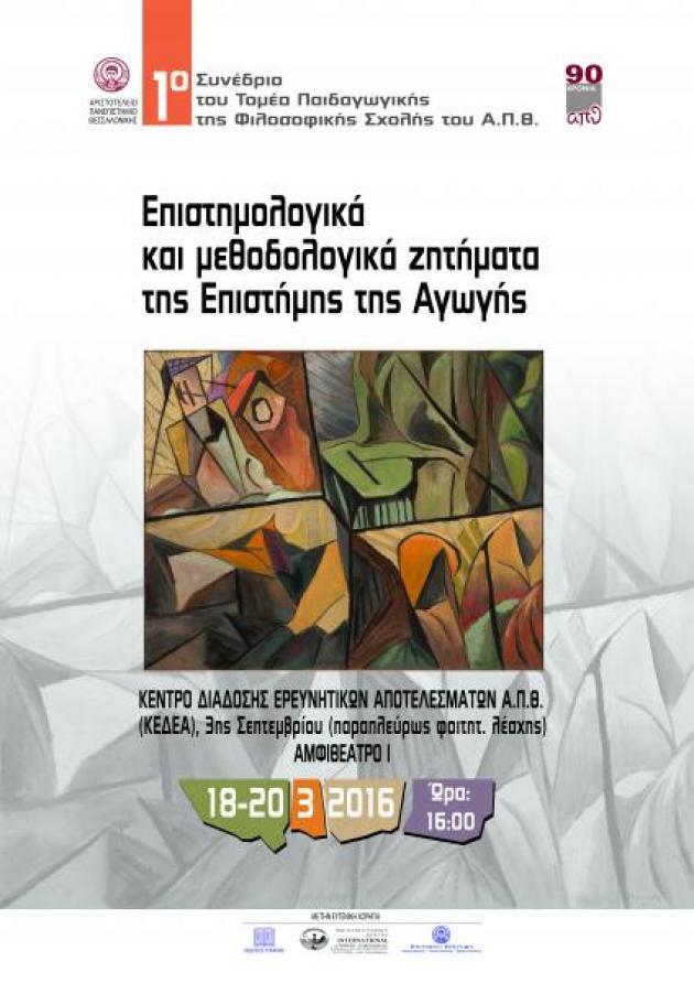 1ο Συνέδριο του Τομέα Παιδαγωγικής της Φιλοσοφικής Σχολής του ΑΠΘ. 18-20 Μαρτίου στο ΚΕΔΕΑ ΑΠΘ. Σκοπός του Συνεδρίου είναι η ανάπτυξη διαλόγου αναφορικά με τις επιστημολογικές κατευθύνσεις της Επιστήμης της Αγωγής, τους κλάδους της, το αντικείμενό της, τη διεπιστημονική συνεργασία της και τα μεθοδολογικά της εργαλεία.