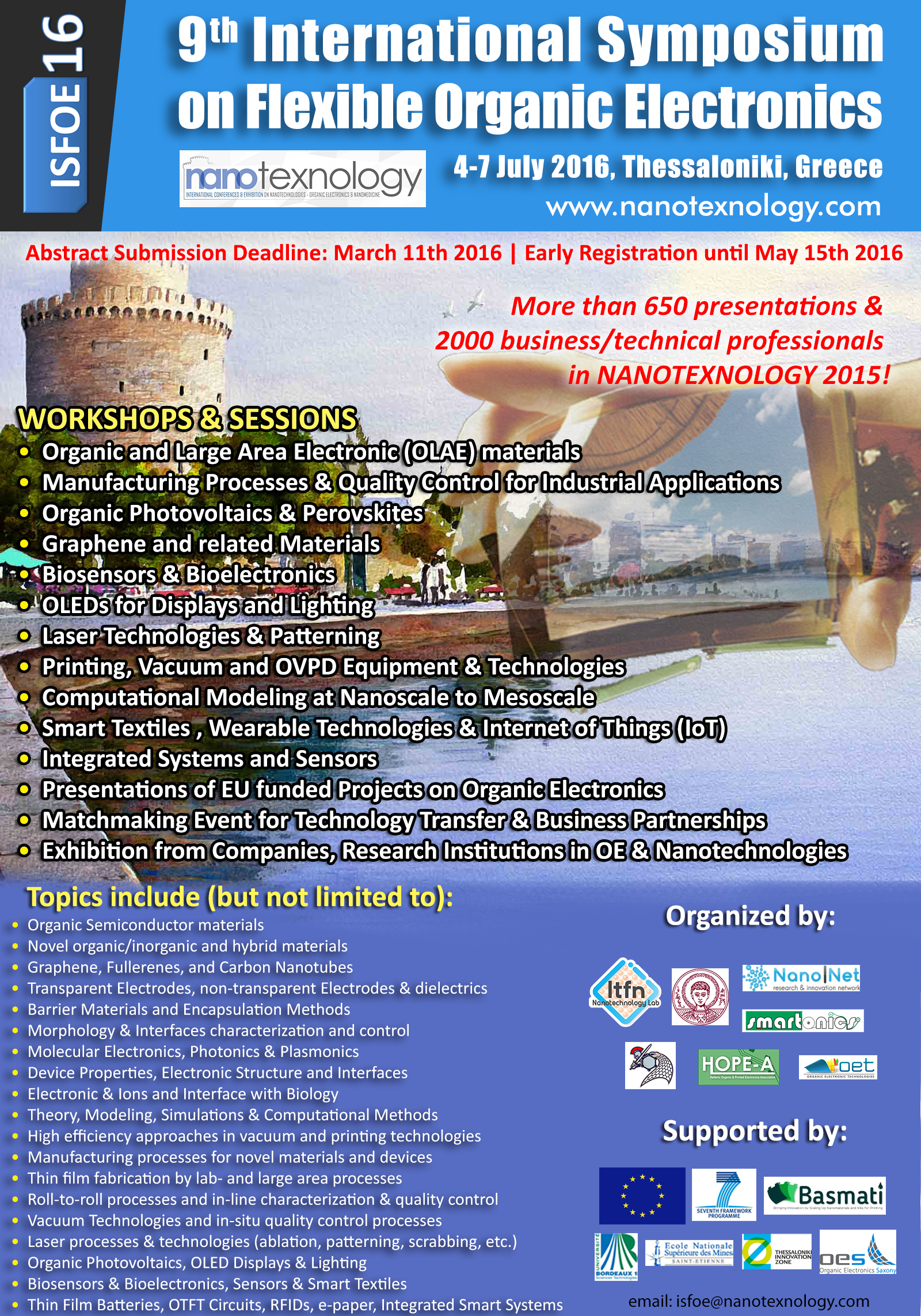ISFOE is the biggest scientific & technology event in Flexible Organic & Printed Electronics (OEs), that promotes the Research, Technology and Innovation in OE nanomaterials, Manufacturing Processes, Devices and Applications and Solutions.