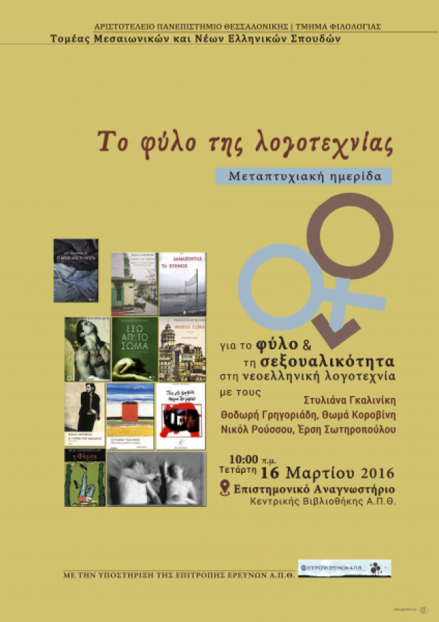 Ο Τομέας Μεσαιωνικών και Νέων Ελληνικών Σπουδών του Τμήματος Φιλολογίας ΑΠΘ διοργανώνει ημερίδα για το φύλο και τη σεξουαλικότητα στη νεοελληνική λογοτεχνία με τίτλο «Το φύλο της λογοτεχνίας» την Τετάρτη 16 Μαρτίου 2016 στο Επιστημονικό Αναγνωστήριο της Κεντρικής Βιβλιοθήκης ΑΠΘ.
