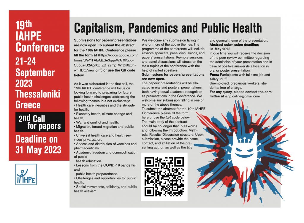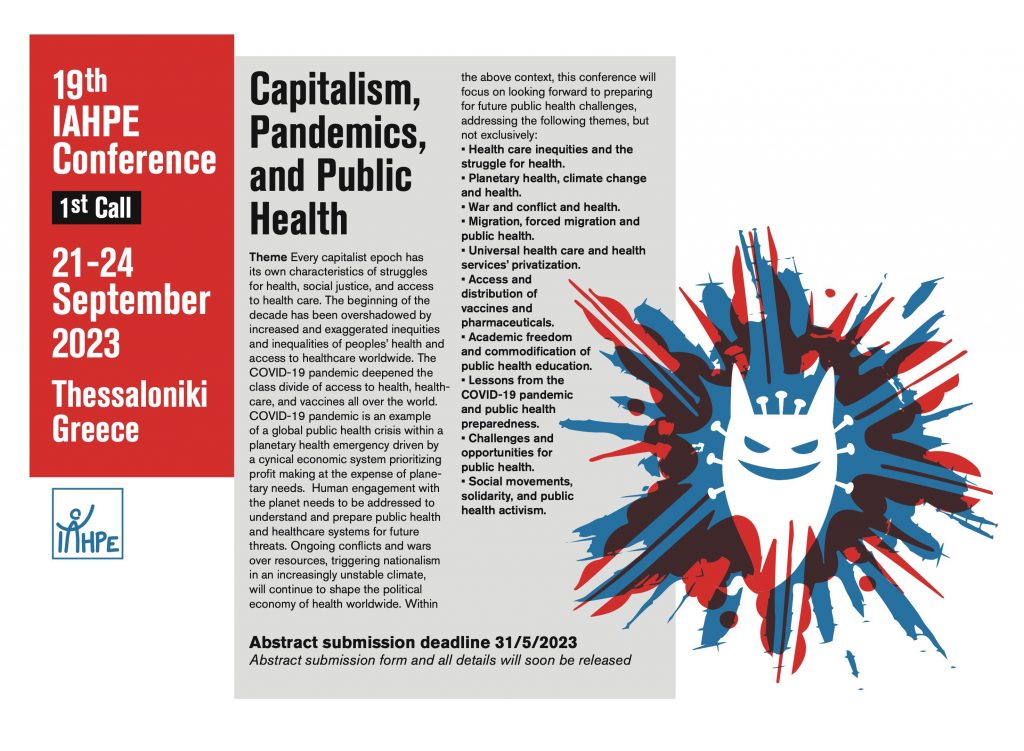 Στις 21-24 Σεπτεμβρίου 2023 θα πραγματοποιηθεί στη Θεσσαλονίκη το 19ο συνέδριο της Διεθνούς Ένωσης για την Πολιτική Υγείας στην Ευρώπη (IAHPE) με κεντρικό θέμα: “Καπιταλισμός, Πανδημίες και Δημόσια Υγεία”.