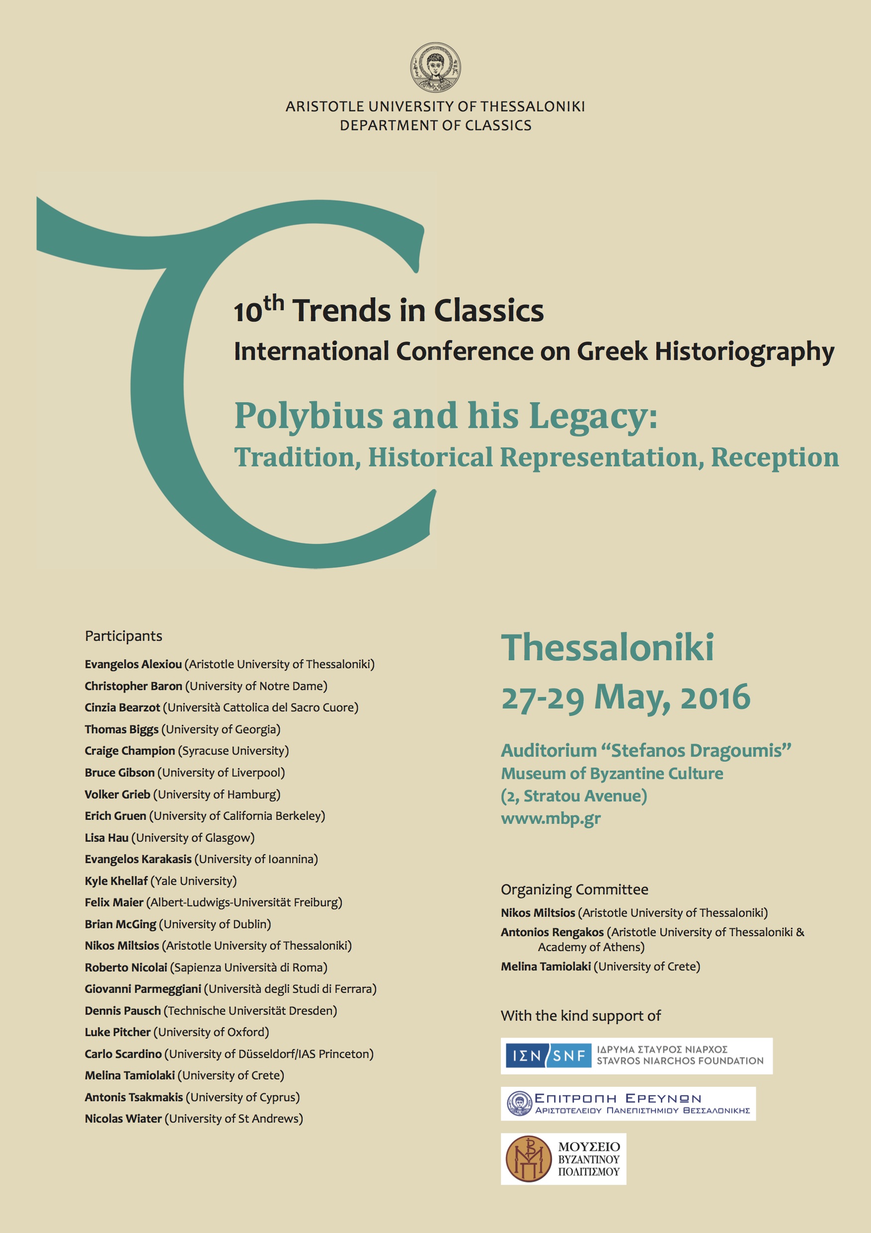 Το Τμήμα Φιλολογίας του Αριστοτελείου Πανεπιστημίου Θεσσαλονίκης διοργανώνει στη Θεσσαλονίκη από 27 έως 29 Μαΐου 2016 το 10ο Διεθνές Συνέδριο για τις Σύγχρονες Τάσεις στην Κλασική Φιλολογία με τίτλο “Polybius and his Legacy: Tradition, Historical Representation, Reception (Ο Πολύβιος και η Παρακαταθήκη του: Παράδοση, Ιστορική Αναπαράσταση, Πρόσληψη)”.