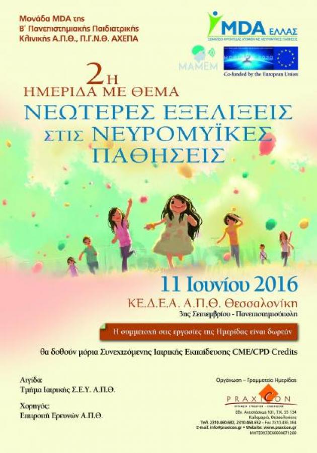H Προέδρος της Ημερίδας, Καθηγήτρια Παιδιατρικής-Ανοσολογίας Α.Π.Θ. κα Μαρία Χατζηστυλιανού-Σιδηροπούλου, σας προσκαλεί στη 2η Ημερίδα με θέμα «Νεώτερες Εξελίξεις στις Νευρομυϊκές Παθήσεις», που διοργανώνεται από τη Μονάδα MDA της Β’ Παν. Παιδιατρικής Κλινικής Α.Π.Θ. σε συνεργασία με το MDA Ελλάς (Σωματείο για τη φροντίδα των ατόμων με νευρομυϊκές παθήσεις) και η οποία θα πραγματοποιηθεί στις 11 Ιουνίου 2016, στο συνεδριακό κέντρο του ΚΕ.Δ.Ε.Α. Α.Π.Θ. (3ης Σεπτεμβρίου – Πανεπιστημιούπολη Θεσσαλονίκης).