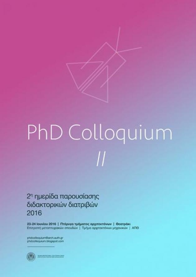 Το Τμήμα Αρχιτεκτόνων του ΑΠΘ και η επιτροπή μεταπτυχιακών σπουδών διοργανώνει τη 2η ημερίδα παρουσίασης των διδακτορικών διατριβών (PhD Colloquium ΙΙ) που πραγματοποιούνται στο Τμήμα. Η ημερίδα είναι ανοιχτή για το κοινό και θα πραγματοποιηθεί την Πέμπτη 23 και Παρασκευή 24 Ιουνίου 2016 στο Θεατράκι, στο Τμήμα Αρχιτεκτόνων του ΑΠΘ.