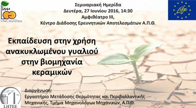 Το Εργαστήριο Μετάδοσης Θερμότητας και Περιβαλλοντικής Μηχανικής ΑΠΘ στο πλαίσιο του Ευρωπαικού Προγράμματος LIFE CLAYGLASS  με τίτλο “Προσαρμογή στην κλιματική αλλαγή της βιομηχανίας δομικών κεραμικών υλικών μέσω της χρήσης ανακυκλωμένου γυαλιού ως κεραμικό ροής” σας προσκαλεί στην σεμιναριακή ημερίδα που θα γίνει την Δευτέρα 27/06/2016 στις 14:30 στο Αμφιθέατρο ΙΙΙ του ΚΕΔΕΑ.