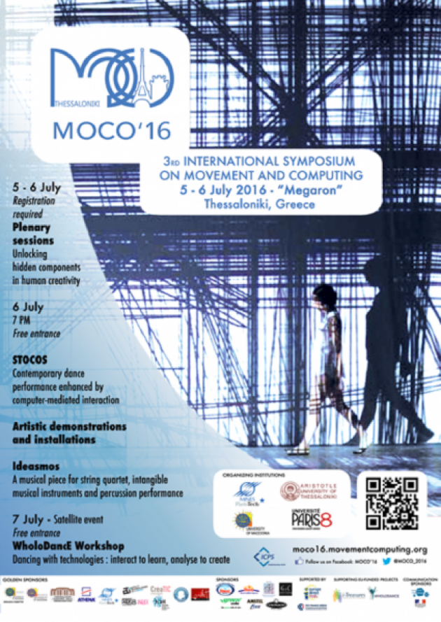 Μετά τις δύο προηγούμενες επιτυχημένες διοργανώσεις του International Workshop on Movement and Computing (MOCO) στο IRCAM (Παρίσι, Γαλλία) το 2014, καθώς και στο Πανεπιστήμιο Simon Fraser (Βανκούβερ, Καναδάς) το 2015, το MOCO, που φέτος αναβαθμίζεται σε συμπόσιο, θα φιλοξενηθεί στο Μέγαρο Μουσικής Θεσσαλονίκης (Μ2) στις 5-6 Ιουλίου. Το MOCO΄16 συνδιοργανώνεται από τα Ανώτατα Εκπαιδευτικά Ιδρύματα MINES ParisTech (Γαλλία), Paris 8 University (Γαλλία), Πανεπιστήμιο Μακεδονίας και  Αριστοτέλειο Πανεπιστήμιο Θεσσαλονίκης.
