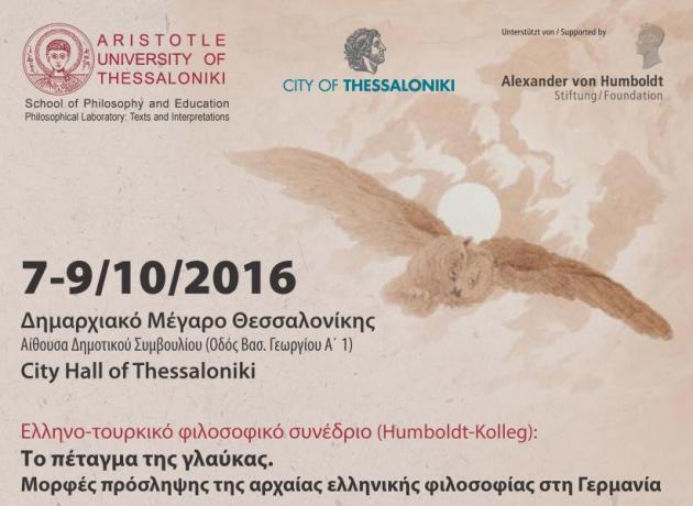 Το Εργαστήριο Φιλοσοφίας του ΑΠΘ «Κείμενα και Ερμηνείες», ο Δήμος Θεσσαλονίκης και το Γερμανικό Ίδρυμα «Alexander von Humboldt-Stiftung» διοργανώνουν Ελληνο-τουρκικό Φιλοσοφικό Συνέδριο, με τίτλο «Το πέταγμα της γλαύκας. Μορφές πρόσληψης της αρχαίας ελληνικής φιλοσοφίας στη Γερμανία» θα πραγματοποιηθεί από τις 7 έως τις 9 Οκτωβρίου 2016, στο Δημαρχιακό Μέγαρο Θεσσαλονίκης (Αίθουσα Δημοτικού Συμβουλίου).