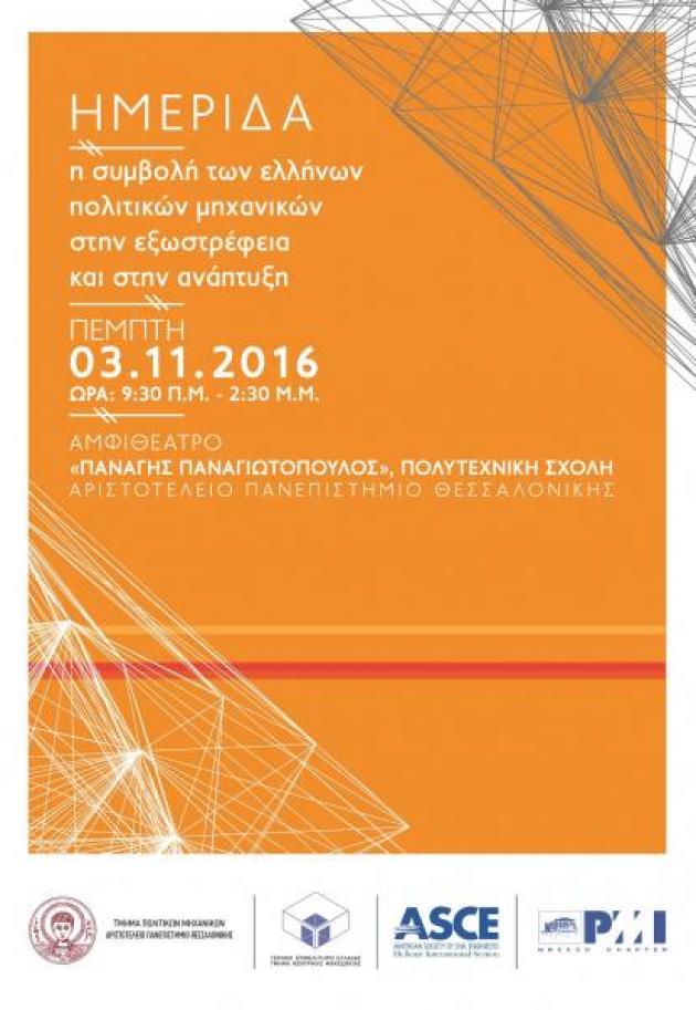 Το Τμήμα Πολιτικών Μηχανικών του Α.Π.Θ. σε συνεργασία με το Τεχνικό Επιμελητήριο Ελλάδας/Τμήμα Κεντρικής Μακεδονίας, το Ελληνικό Παράρτημα του ASCE και του PMI διοργανώνει την Πέμπτη 3 Νοεμβρίου και ώρα 9:30-14:30 στο Αμφιθέατρο Π. Παναγιωτόπουλος της Πολυτεχνικής Σχολής του Α.Π.Θ. ημερίδα με Θέμα «Η Συμβολή των Ελλήνων Πολιτικών Μηχανικών στην Εξωστρέφεια και στην Ανάπτυξη».