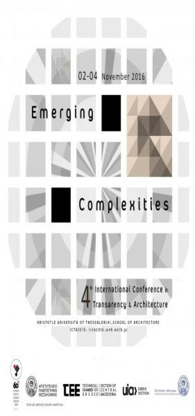 Ο Ε’ Τομέας Αρχιτεκτονικού Σχεδιασμού και Τεχνολογίας του τμήματος Αρχιτεκτόνων Μηχανικών του ΑΠΘ διοργανώνει το τέταρτο διεθνές συνέδριο Αρχιτεκτονικής και Διαφάνειας με τίτλο «Emerging Complexities» από 02.11-04.11.2016 στο Κτίριο της Επιτροπής Ερευνών, 3ης Σεπτεμβρίου – Πανεπιστημιούπολη 546 36 ΘΕΣΣΑΛΟΝΙΚΗ