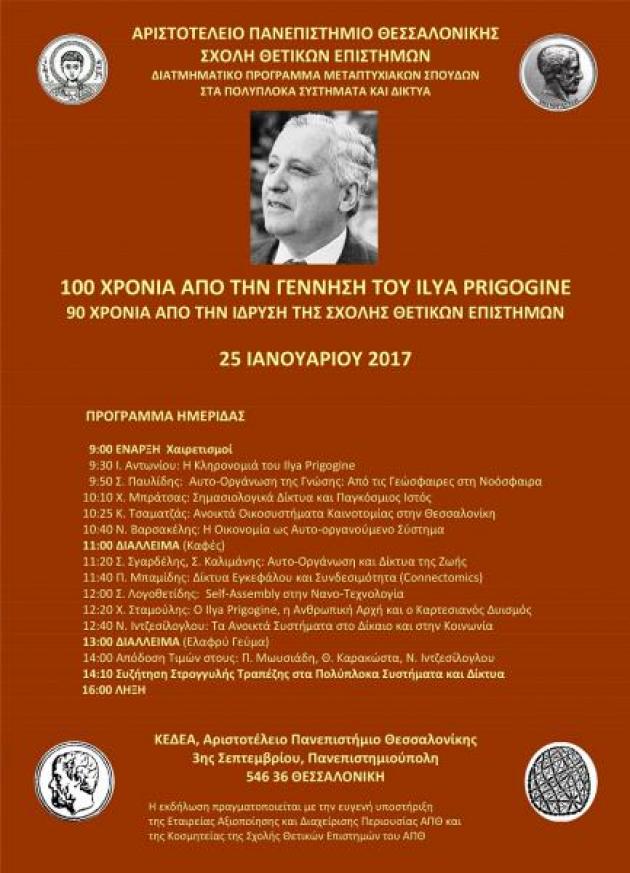 Το Διατμηματικό Πρόγραμμα Μεταπτυχιακών Σπουδών στα Πολύπλοκα Συστήματα και Δίκτυα, της Σχολής Θετικών Επιστήμων του ΑΠΘ, στο πλαίσιο του εορτασμού των 90 χρόνων απο την ίδρυση της Σχολής, διοργανώνει ημερίδα με τίτλο ” 100 χρόνια απο τη γέννηση του Ilya Prigogine” την Τετάρτη 25 Ιανουαρίου 2017.