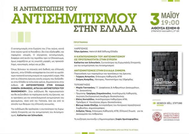 Το Ίδρυμα Χάινριχ Μπελ Ελλάδας και Έδρα Εβραϊκών Σπουδών του ΑΠΘ διοργανώνουν εκδήλωση με αφορμή την έκδοση της έκθεσης «Ο αντισημιτισμός στην Ελλάδα σήμερα: Εκφάνσεις, αίτια και αντιμετώπιση του φαινομένου» που συνέταξε η ομάδα ερευνητών Γιώργος Αντωνίου, Σπύρος Κοσμίδης, Ηλίας Ντίνας, Λεόν Σαλτιέλ.