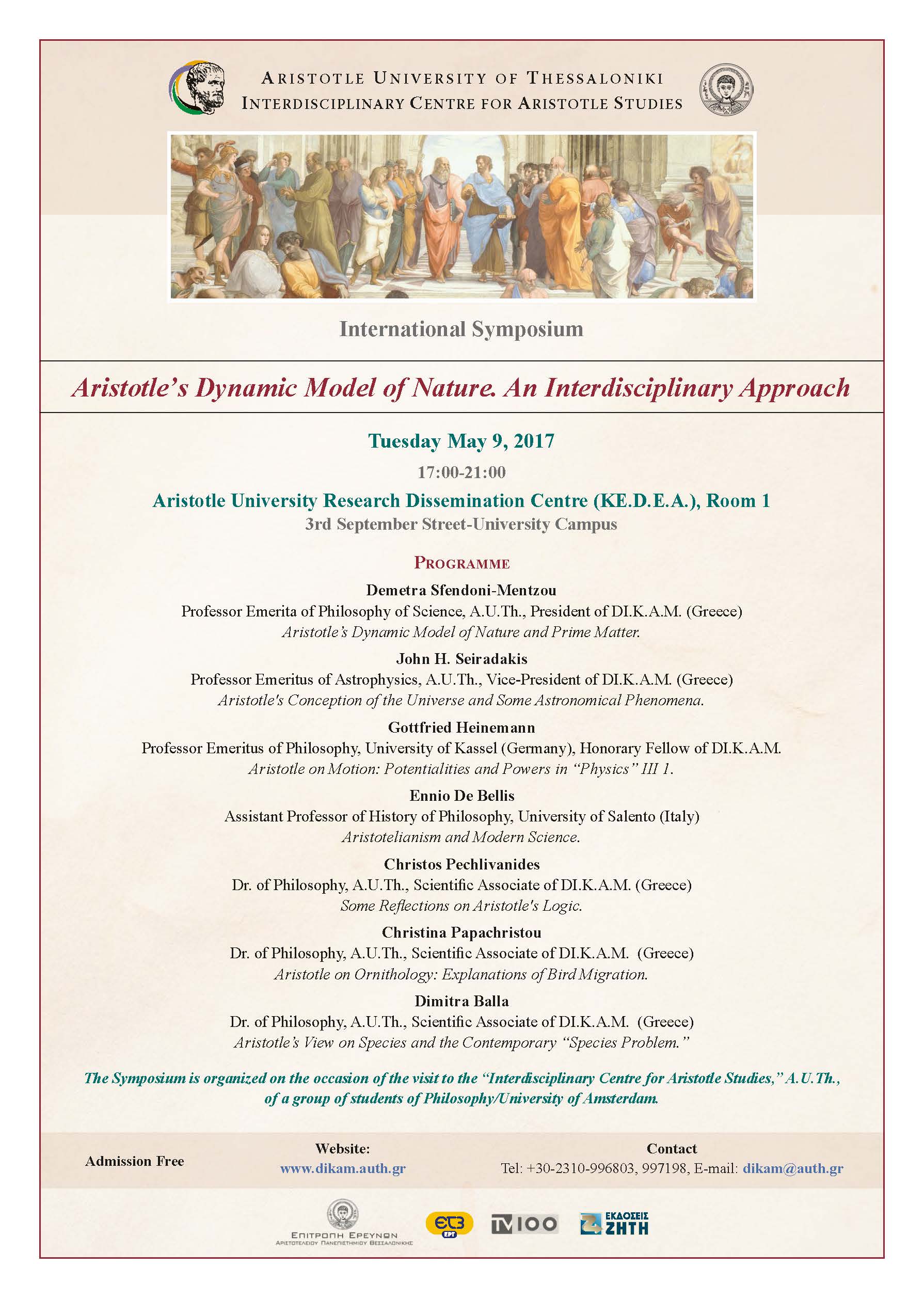 Το «Διεπιστημονικό Κέντρο Αριστοτελικών Μελετών», Α.Π.Θ. (ΔΙ.Κ.Α.Μ.), διοργανώνει σε συνέχεια των εκδηλώσεων του 2016 για την Επέτειο των 2400 χρόνων από τη γέννηση του Αριστοτέλη, Διεθνές Συμπόσιο με θέμα «Aristotle’s Dynamic Model of Nature. An Interdisciplinary Approach”.