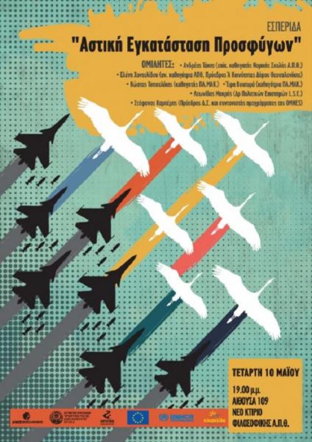 «Αστική Εγκατάσταση Προσφύγων» είναι το θέμα της εσπερίδας που θα πραγματοποιηθεί την Τετάρτη 10 Μαΐου 2017 και ώρες 19.00 – 21.30, στην Αίθουσα 109, στο νέο κτίριο της Φιλοσοφικής Σχολής του ΑΠΘ και πραγματοποιείται στο πλαίσιο του ερευνητικού προγράμματος «Προσφυγικές Ροές και Δομές Αλληλεγγύης» του ΑΠΘ και διοργανώνεται από τον Δήμο Θεσσαλονίκης και την εθελοντική οργάνωση ΟΜΝΕS.