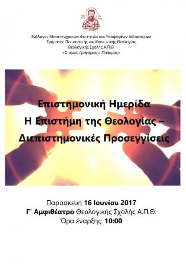 Η Επιστημονική Ημερίδα «Η Επιστήμη της Θεολογίας – Διεπιστημονικές Προσεγγίσεις», που διοργανώνεται από το Σύλλογο «Ο άγιος Γρηγόριος ο Παλαμάς» θα λάβει χώρα στο Γ΄ Αμφιθέατρο του Β΄ Ορόφου της Θεολογικής Σχολής Α.Π.Θ., την Παρασκευή, 16 Ιουνίου 2017, με ώρα έναρξης 10:00.