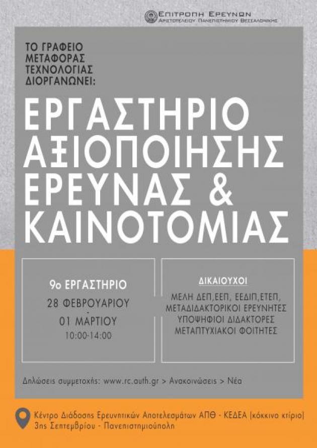 9ο Εργαστήριo Αξιοποίησης Έρευνας & Καινοτομίας του Γραφείου Μεταφοράς Τεχνολογίας ΑΠΘ