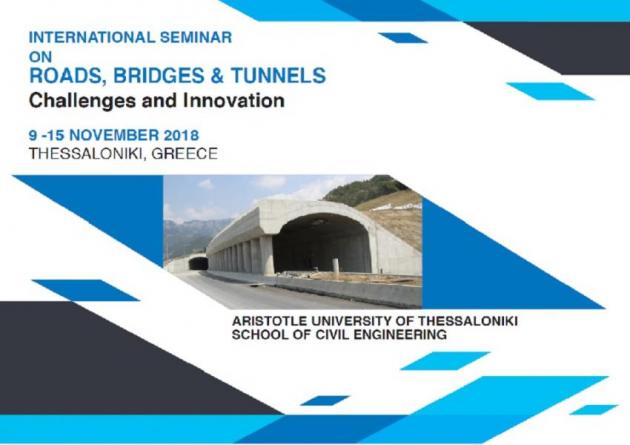 Το Τμήμα Πολιτικών Μηχανικών του ΑΠΘ διοργανώνει ένα Διεθνές Σεμινάριο, εκπαιδευτικού χαρακτήρα, με τίτλο «International Seminar on Roads, Bridges and Tunnels: Challenges and Innovation» που θα πραγματοποιηθεί στη Θεσσαλονίκη από 9 έως 15 Νοεμβρίου 2018. Το Σεμινάριο θα αποτελείται από 3 Ενότητες: Γέφυρες (9 και 10/11), Αυτοκινητόδρομοι, Κατασκευή και Διαχείριση (12 και 13/11), Γεωτεχνικά και Σήραγγες (14 και 15/11).