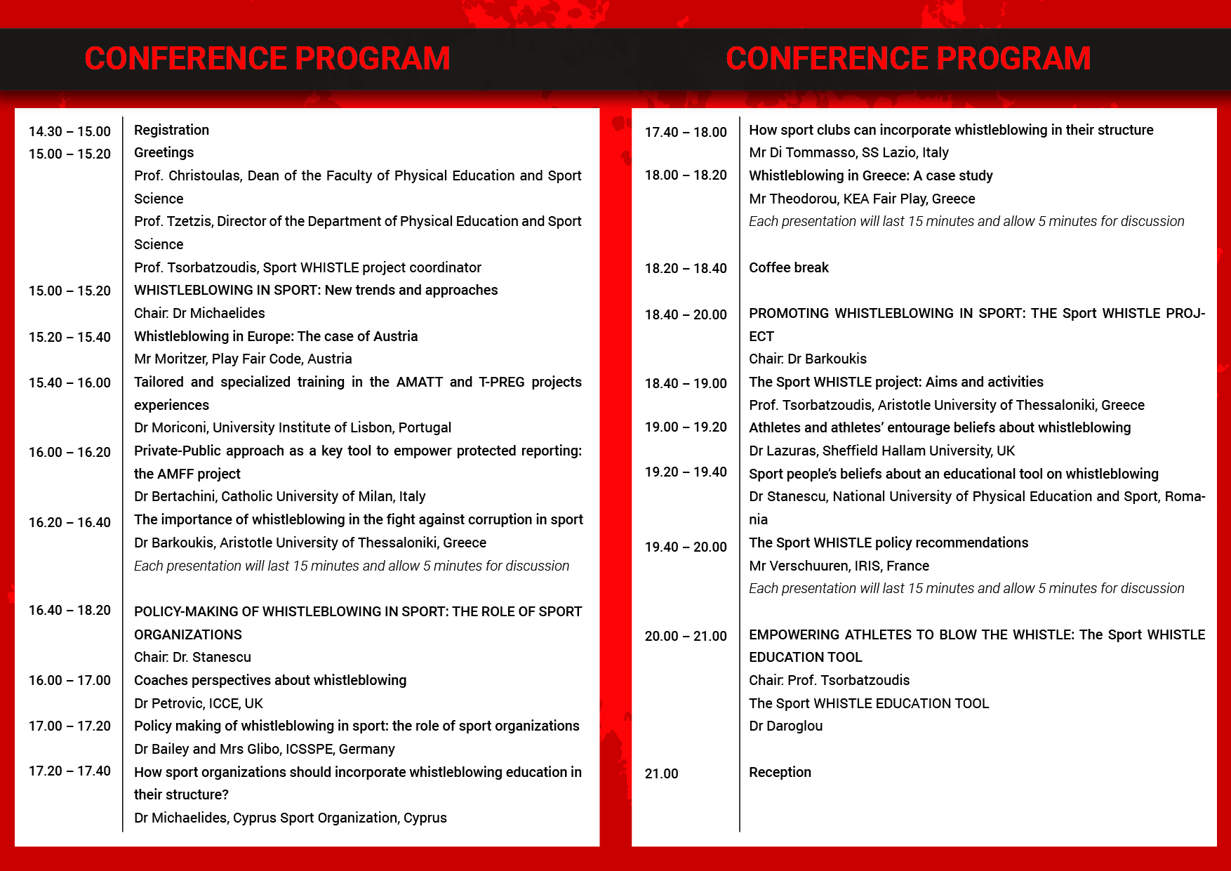 Το Διεθνές Συνέδριο για την Αναφορά Παρατυπιών στον Αθλητισμό περιλαμβάνει ενότητες για την παρουσίαση ερευνητικών δεδομένων σχετικά με τα οφέλη της αναφοράς παρατυπιών στον αθλητισμό στην Ευρώπη και ενός εκπαιδευτικού εργαλείου σχεδιασμένου να προωθήσει και να διευκολύνει την αναφορά παρατυπιών στον αθλητισμό. Επίσης, φορείς διαμόρφωσης πολιτικής θα συζητήσουν για τις πολιτικές πρωτοβουλίες που πρέπει να αναπτυχθούν για την ενημέρωση του κόσμου του αθλητισμού σχετικά με τους τρόπους αναφοράς και την πληρέστερη αντιμετώπιση των επιβλαβών παρατυπιών στον αθλητισμό.