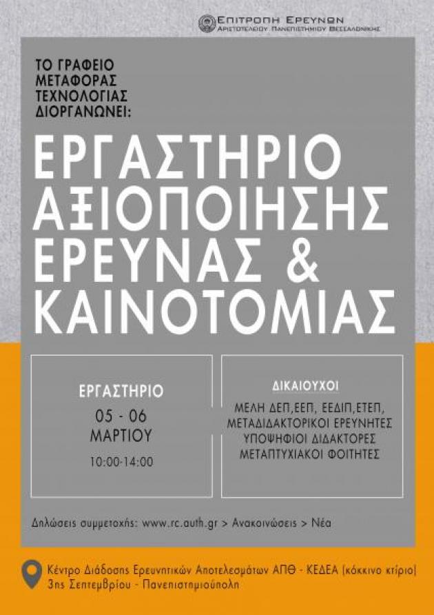 Στόχος του εργαστηρίου είναι η εκπαίδευση και κινητοποίηση των ερευνητών του ΑΠΘ, όλων των επιστημονικών πεδίων και βαθμίδων, στην αξιοποίηση της ερευνητικής τους δραστηριότητας προς όφελος της οικονομίας και της κοινωνίας.