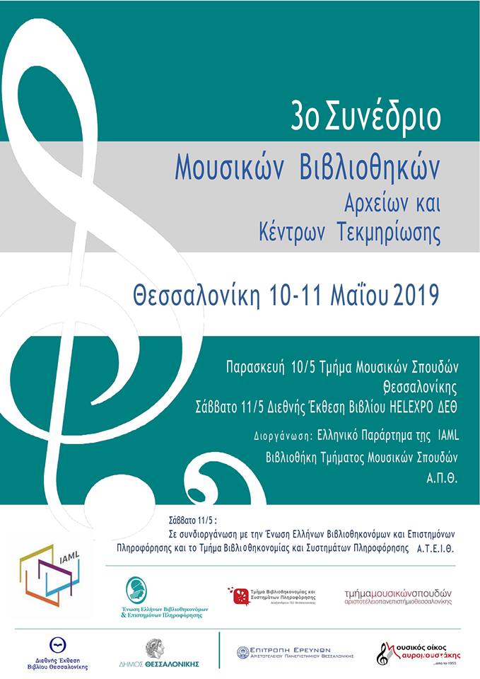 Με χαρά σας προσκαλούμε στο 3ο Συνέδριο Μουσικών Βιβλιοθηκών και Αρχείων που θα πραγματοποιηθεί την Παρασκευή 10 και το Σάββατο 11 Μαϊου 2019 στη Θεσσαλονίκη, σε διοργάνωση του Ελληνικού Παραρτήματος της Διεθνούς Ένωσης Μουσικών Βιβλιοθηκών και Αρχείων (IALM) και του Τμήματος Μουσικών Σπουδών του ΑΠΘ.