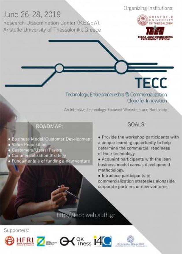 Το Αριστoτέλειο Πανεπιστήμιο Θεσσαλονίκης (ΑΠΘ) σας προσκαλεί σε τριήμερο Διεθνές Workshop και Bootcamp με τίτλο: “TECC – Technology, Entrepreneurship & Commercialization Cloud for Innovation”, που συνδιοργανώνει με το Texas A&M Engineering Experiment Station (TEES) των ΗΠΑ στις 26-28 Ιουνίου 2019 στο Κέντρο Διάδοσης Ερευνητικών Αποτελεσμάτων (ΚΕ.Δ.Ε.Α) του ΑΠΘ.