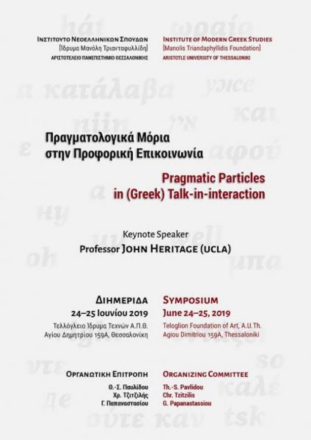 Το Ινστιτούτο Νεοελληνικών Σπουδών [Ίδρυμα Μανόλη Τριανταφυλλίδη] του Α.Π.Θ., στο πλαίσιο των δραστηριοτήτων του για τον προφορικό λόγο και του ερευνητικού προγράμματος “Γλωσσική Διεπίδραση και Ανάλυση Συνομιλίας”, διοργανώνει την τρίτη διημερίδα για την ελληνική γλώσσα στην προφορική επικοινωνία στις 24-25 Ιουνίου 2019 στη Θεσσαλονίκη. Αντικείμενο της εφετινής διημερίδας είναι τα Πραγματολογικά Μόρια στην Προφορική Επικοινωνία.