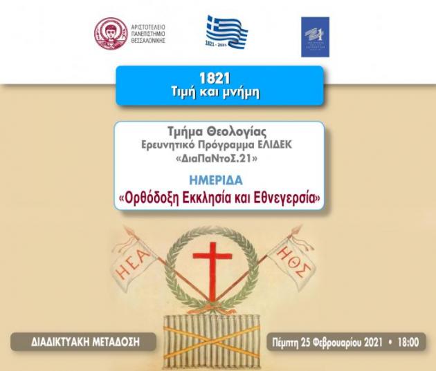 Το Τμήμα Θεολογίας του ΑΠΘ, σε συνεργασία  με το Ερευνητικό πρόγραμμα ΕΛΙΔΕΚ «ΔιαΠαΝτοΣ.21» [Η διαπάλη παράδοσης και νεωτερικότητας και το Σύνταγμα υπό το «κράτος» της Επανάστασης του 1821],  συμμετέχουν  στις τιμητικές εκδηλώσεις του Αριστοτελείου Πανεπιστημίου Θεσσαλονίκης για την επέτειο των 200 ετών από την Εθνική Παλιγγενεσία, με την διοργάνωση θεματικής επιστημονικής  Ημερίδας, με θέμα: «Ορθόδοξη Εκκλησία και Εθνεγερσία», την Πέμπτη 25 Φεβρουαρίου 2021, ώρα 18.00-21.15