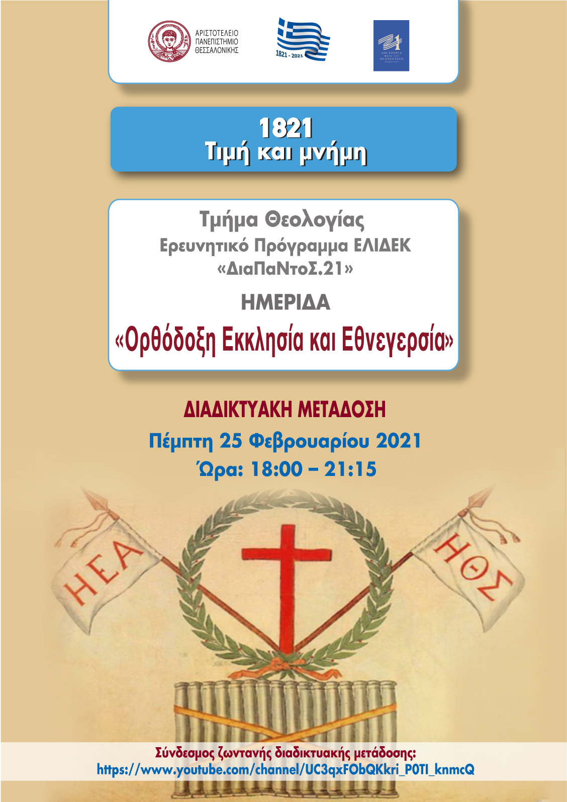 Το Τμήμα Θεολογίας του ΑΠΘ, σε συνεργασία  με το Ερευνητικό πρόγραμμα ΕΛΙΔΕΚ «ΔιαΠαΝτοΣ.21» [Η διαπάλη παράδοσης και νεωτερικότητας και το Σύνταγμα υπό το «κράτος» της Επανάστασης του 1821],  συμμετέχουν  στις τιμητικές εκδηλώσεις του Αριστοτελείου Πανεπιστημίου Θεσσαλονίκης για την επέτειο των 200 ετών από την Εθνική Παλιγγενεσία, με την διοργάνωση θεματικής επιστημονικής  Ημερίδας, με θέμα: «Ορθόδοξη Εκκλησία και Εθνεγερσία», την Πέμπτη 25 Φεβρουαρίου 2021, ώρα 18.00-21.15