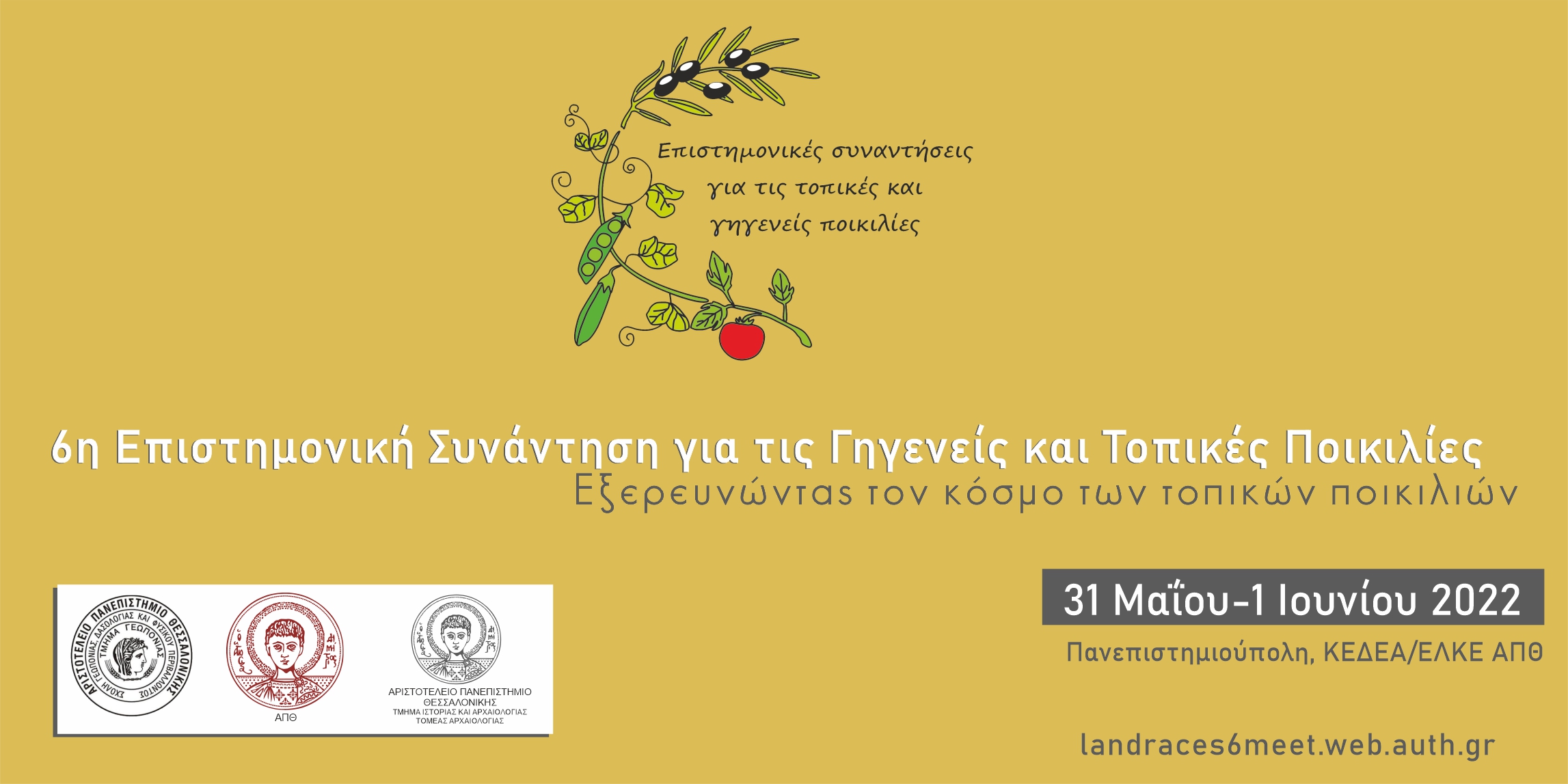 Η 6η Επιστημονική Συνάντηση για τις Τοπικές και Γηγενείς Ποικιλίες διοργανώνεται από την Κοσμητείας Γεωπονίας, Δασολογίας και Φυσικού Περιβάλλοντος, το Τμήμα Γεωπονίας και το Τμήμα Ιστορίας και Αρχαιολογίας του ΑΠΘ, από 31/5 έως 1/6/2022, στο ΚΕΔΕΑ του ΑΠΘ.