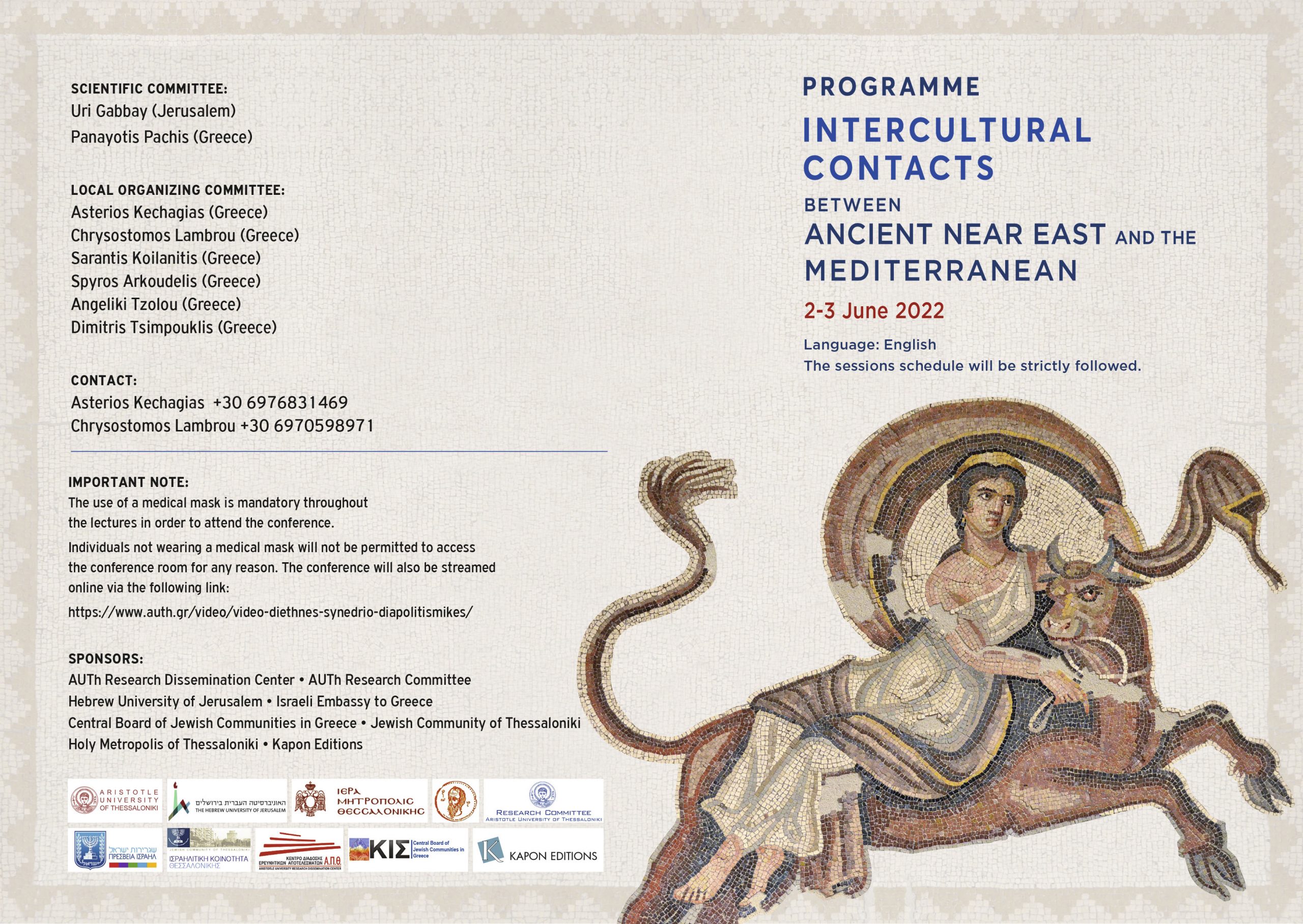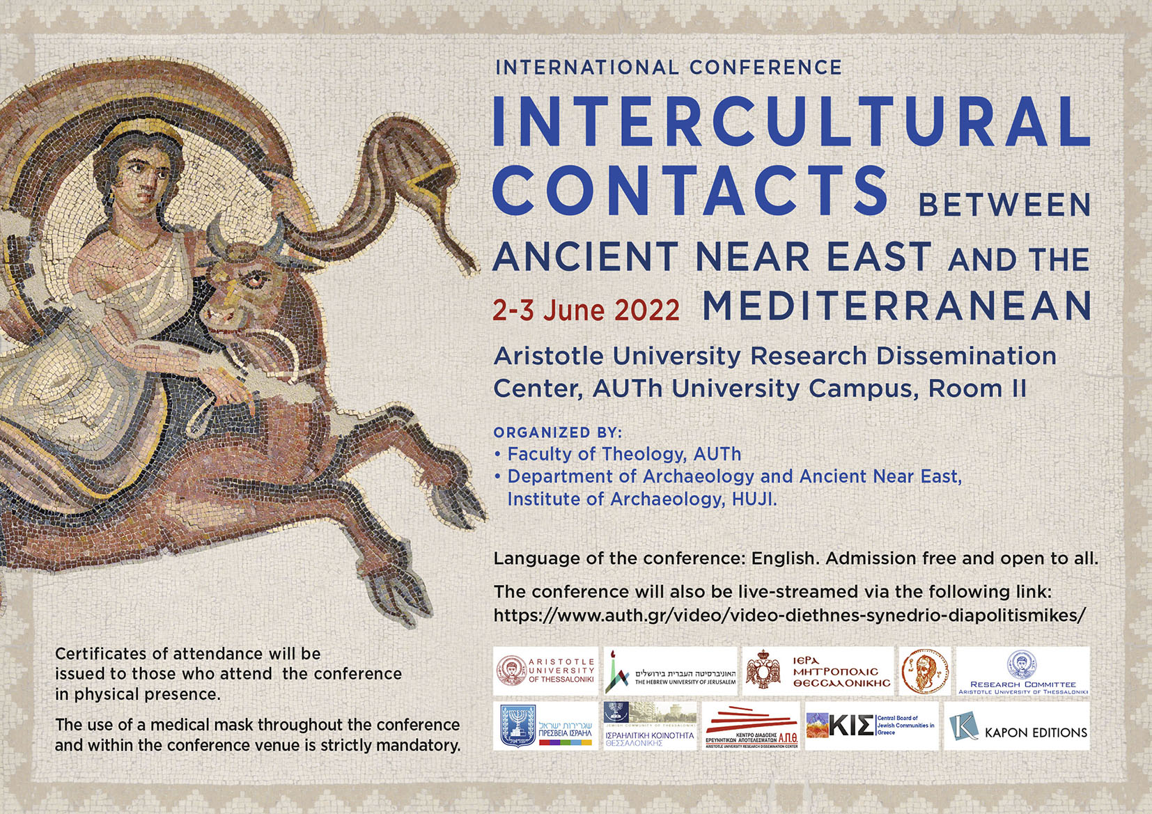 The Faculty of Theology of the Aristotle University of Thessaloniki in cooperation with the Department of Archaeology and Ancient Near East of the Hebrew University of Jerusalem, invite you to the international conference entitled: “Intercultural Contacts between the Ancient Near East and the Mediterranean”, which will take place on June 2 and 3, 2022, at the Room II of the Aristotle University Research Dissemination Centre (KEDEA). The language of the conference will be English and admission is open to all and free of charge. The conference will be broadcast live via the following link: https://www.auth.gr/video/video-diethnes-synedrio-diapolitismikes/