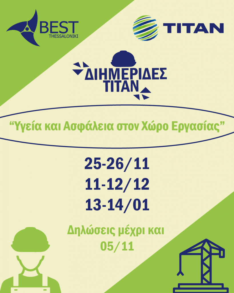 Το BEST Thessaloniki διοργανώνει για 14η συνεχόμενη χρονιά σε συνεργασία με τον όμιλο ΤΙΤΑΝ μια σειρά από διημερίδες με θέμα: «Υγεία και Ασφάλεια στον Χώρο Εργασίας».