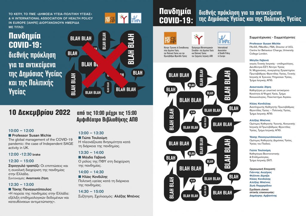 Το ΠΜΣ “Δημόσια Υγεία – Πολιτική Υγείας” του Τμήματος Ιατρικής ΑΠΘ σε συνεργασία με το Κέντρο Έρευνας και Εκπαίδευσης στη Δημόσια Υγεία, την Πολιτική Υγείας και την Πρωτοβάθμια Φροντίδα Υγείας (ΚΕΠΥ) και την International Association of Health Policy in Europe (IAHPE) διοργανώνουν την 3η ετήσια ημερίδα τους με θέμα “Πανδημία COVID-19: μία διεθνής πρόκληση για τα αντικείμενα της Δημόσιας Υγείας και Πολιτικής Υγείας”.